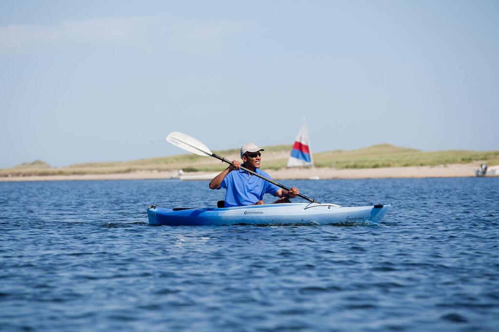 The second reason I would hesitate to to take such a kayak in the water is the relative difficulty in paddling such a kayak. Yes it is maneuverable and stable, but with that comes a larger surface area in contact with the water. This means that to propel it through the water requires quality, efficient, and numerous strokes. This is fine for a 'lake or pond' where you are not fighting tide and current. Where he is pictured a good outgoing tide could quickly move him a mile or more offshore without the strength or ability to get back. That is the real danger of using an inappropriate kayak for the conditions. I have a hard time imagining his security detail allowing him to be put in such a dangerous situation.